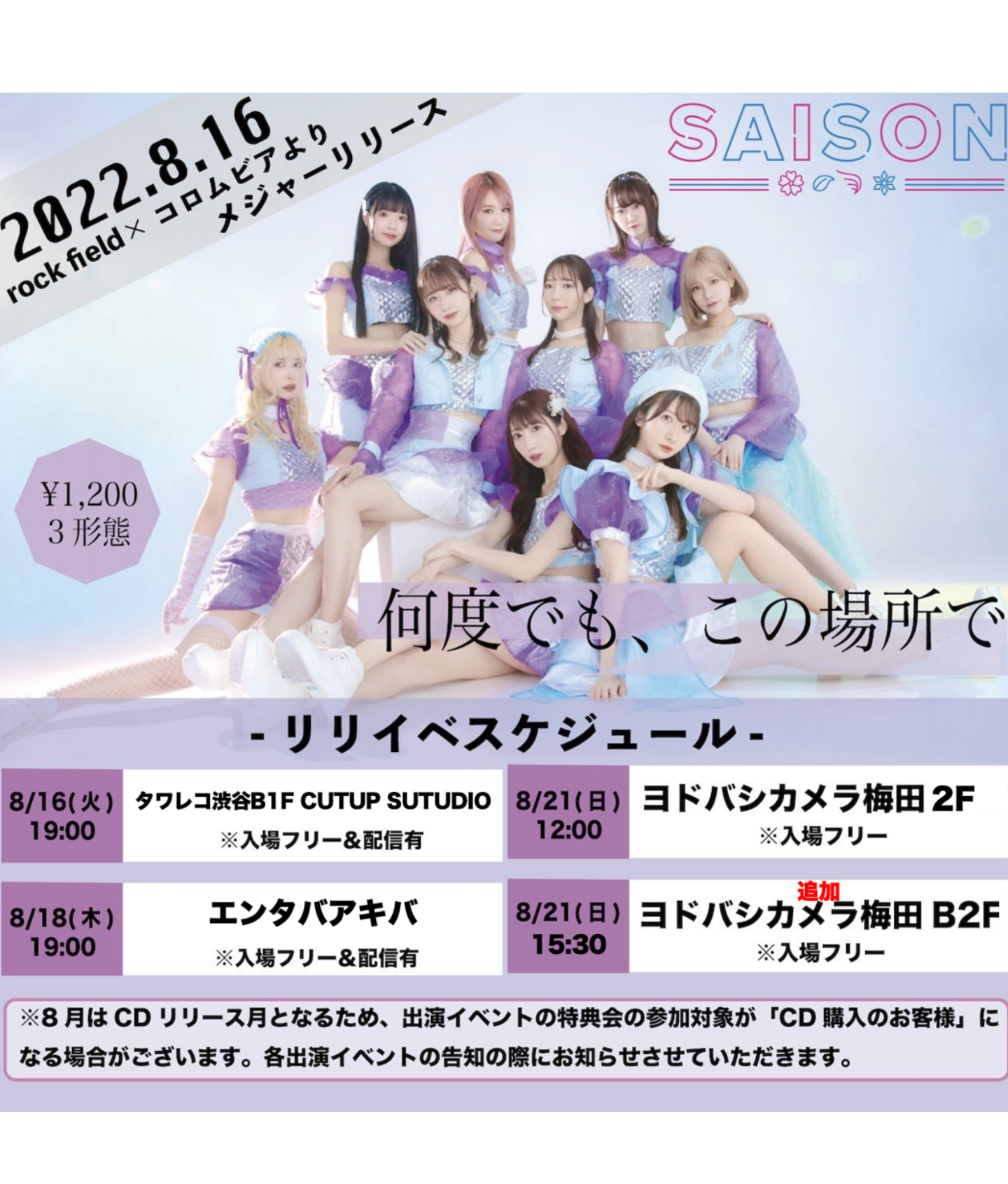 【SAISON】シングル『何度でも、この場所で』ミニライブ&特典会&ライブ配信&インターネットサイン会